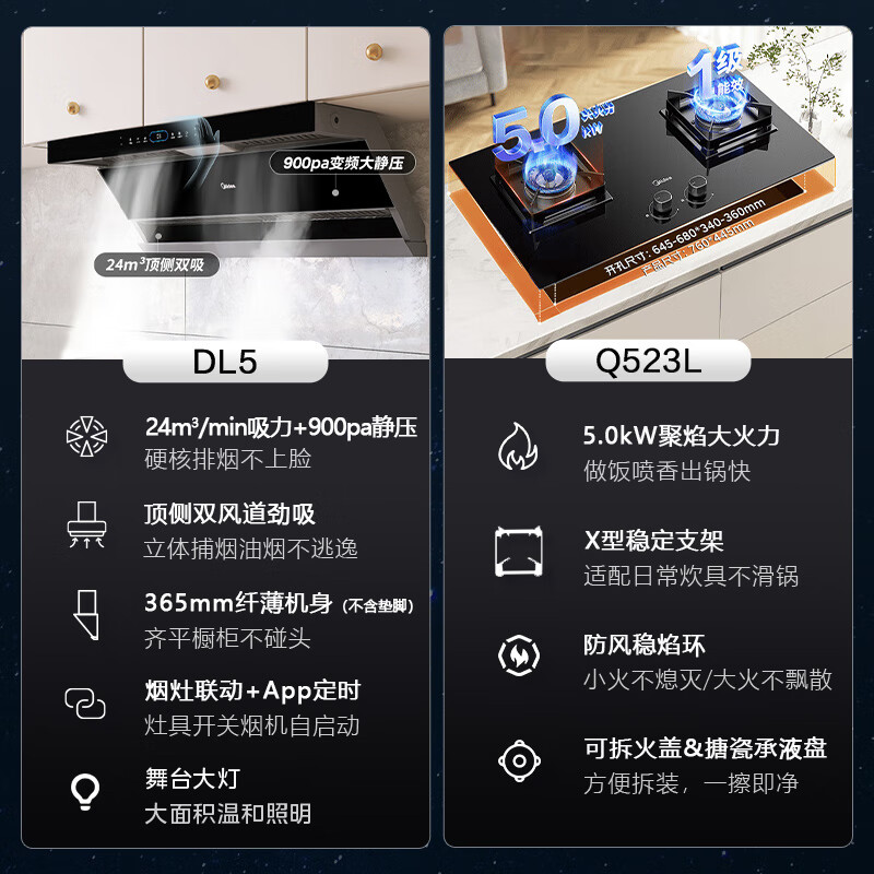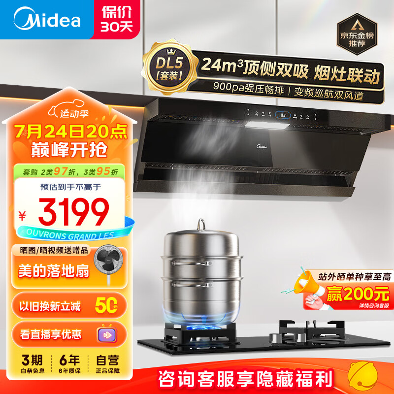美的(Midea)抽油烟机燃气灶具家用顶侧双吸烟灶联动智控变频24风量大吸力超薄近吸烟灶套装DL5+Q523L天然气价格:3199.00元!