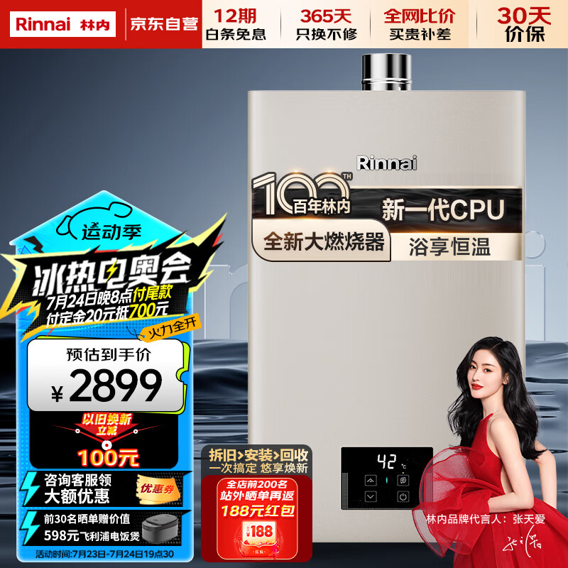 林内(Rinnai)【小蛮腰Pro】13升燃气热水器 全新智慧芯 恒温再升级 天然气热水器13GD32(JSQ26-GD32)以旧换新价格:2899.00元!
