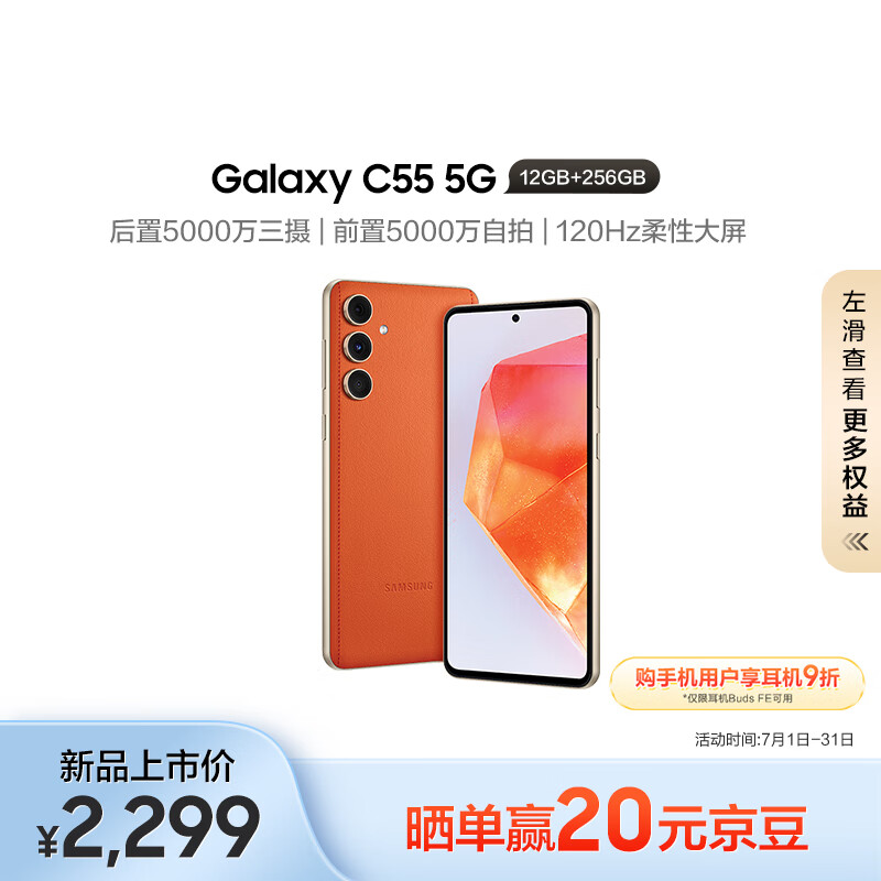 三星(SAMSUNG)Galaxy C55 5G手机 前后5000万像素 拍照手机 Super AMOLED+柔性大屏 12GB+256GB 缤纷橙 游戏手机价格:2299.00元!