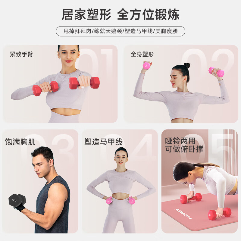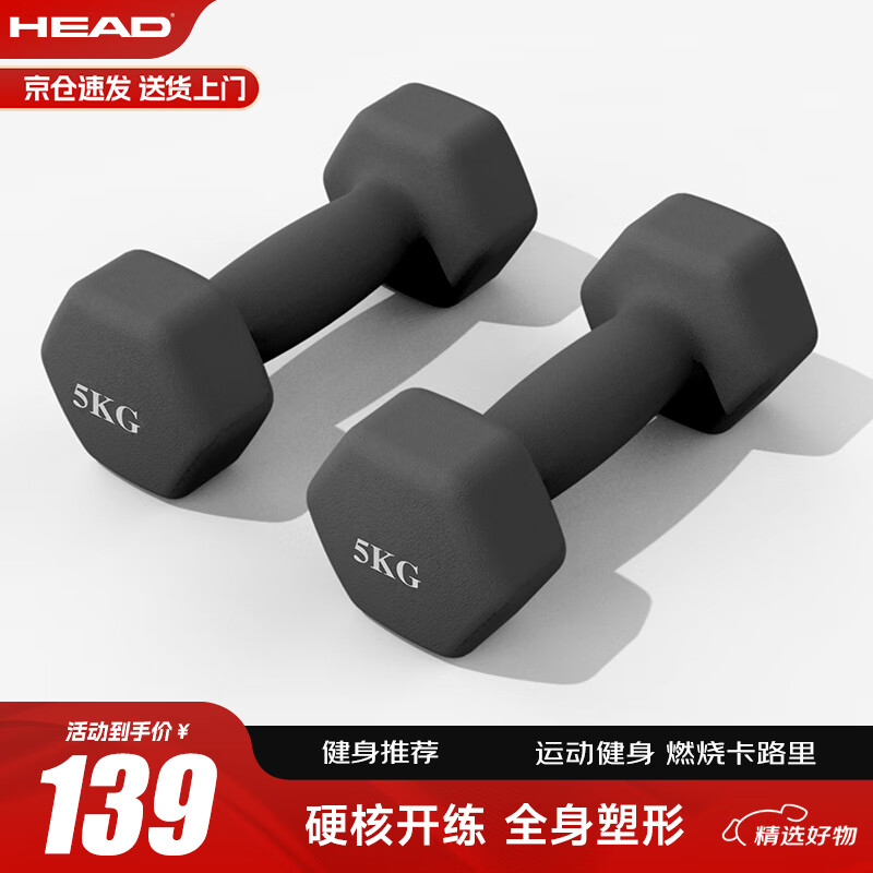 HEAD海德彩色浸塑哑铃男士女士家用纯铁肌肉塑形黑色 5kg*2价格:139.00元!