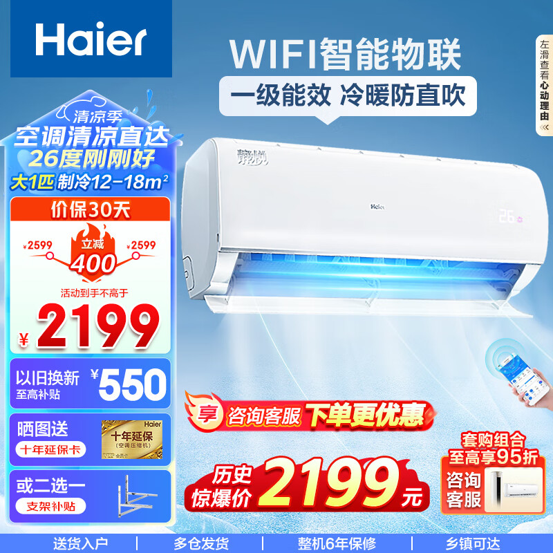 海尔(Haier)静悦 空调挂机 大1匹变频冷暖 新能效 冷暖家用卧室壁挂式空调挂机 智能自清洁价格:2199.00元!
