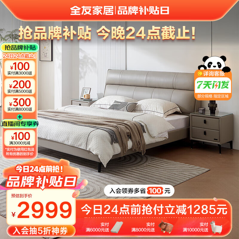 全友家居 头层牛皮床真皮床现代简约卧室高脚双人大床1.8米x2米116033价格:4284.29元!