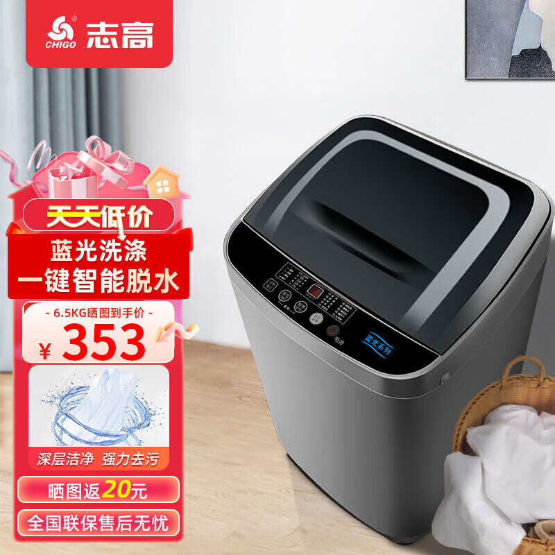 志高(CHIGO)6.5公斤家用全自动洗衣机大容量租房公寓智能波轮洗脱一体机带风干功能XQB65-818宝石灰价格:373.00元!