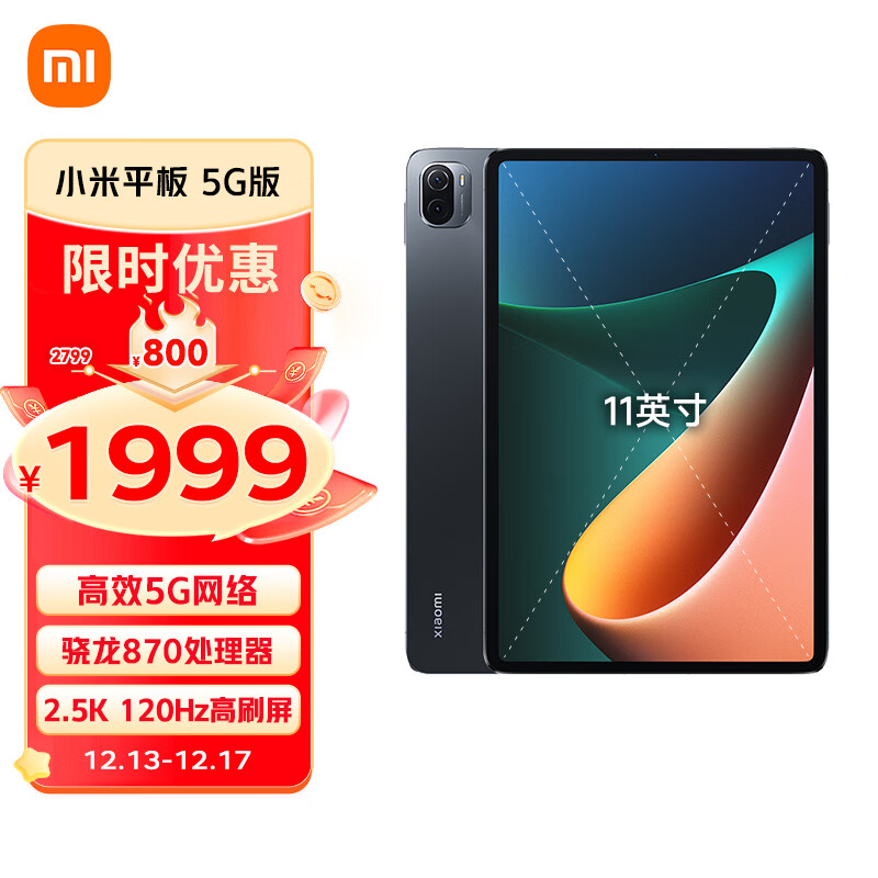 小米平板 5G版 11英寸2.5K高清 120Hz 骁龙870 8G+256GB 67W快充 杜比影音娱乐办公网课平板电脑 黑色价格:1999.00元!