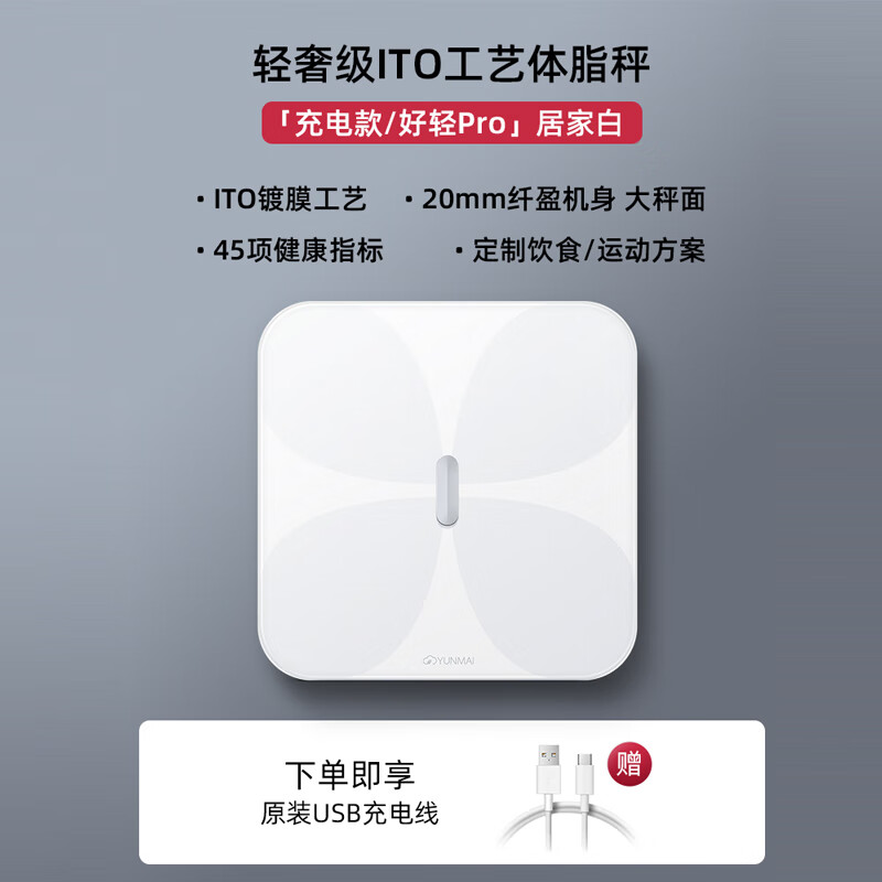 云麦好轻Pro 智能体脂秤充电体重秤 升级45项健康指标电子秤家用人体秤 高精准脂肪秤称重体脂称白色价格:219.00元!
