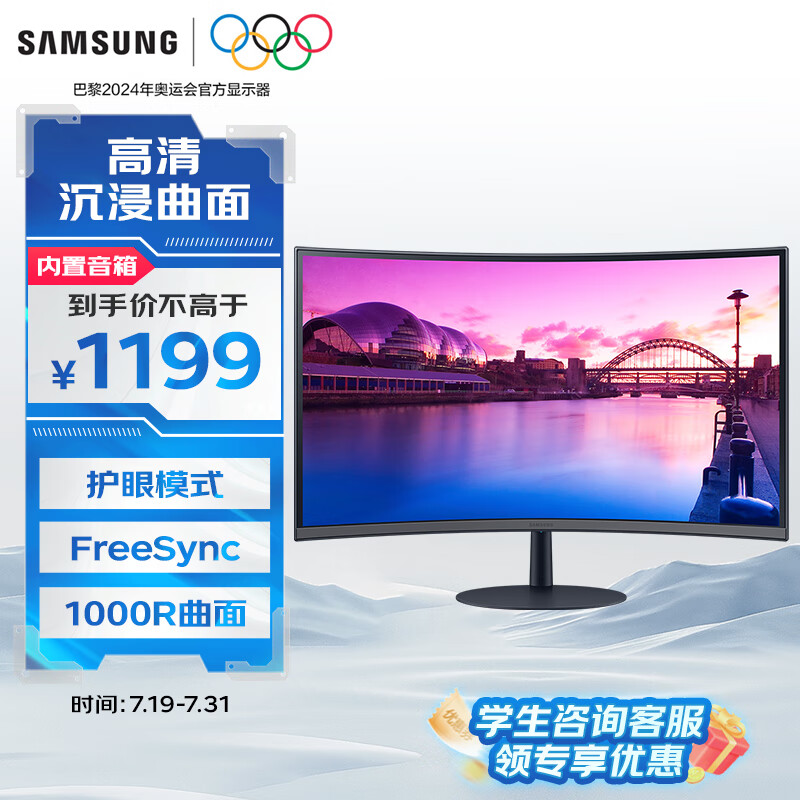三星(SAMSUNG)27英寸 FHD 75Hz 1000R曲面 内置音箱 低蓝光不闪屏认证 FreeSync 电脑 办公 显示器 S27C390价格:1299.00元!
