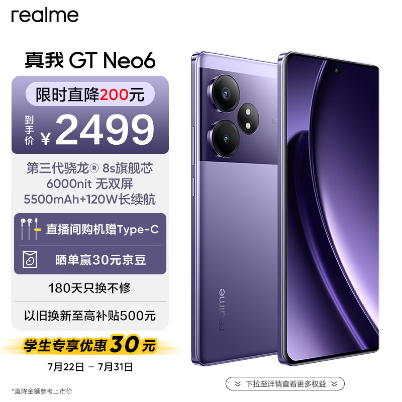 realme真我GT Neo6 第三代骁龙8s旗舰芯 6000nit无双屏 120W光速秒充 电竞5G游戏AI手机 16+512灵犀紫价格:2499.00元!