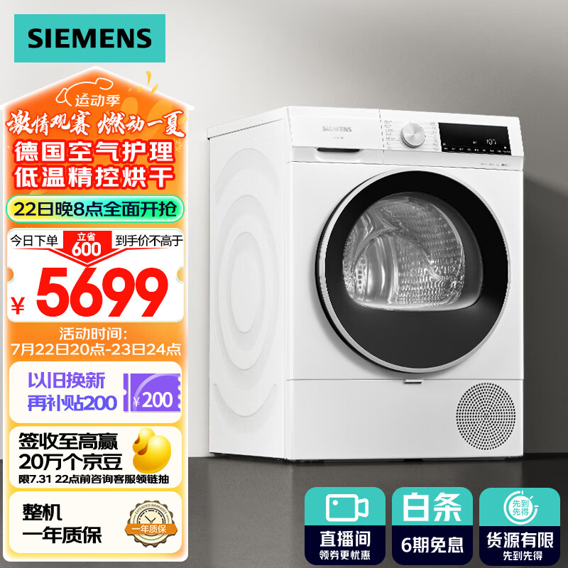 西门子(SIEMENS) 烘干机家用 10公斤热泵干衣机 除菌除螨 蚕丝被专护 WQ53A2D00W价格:5699.00元!