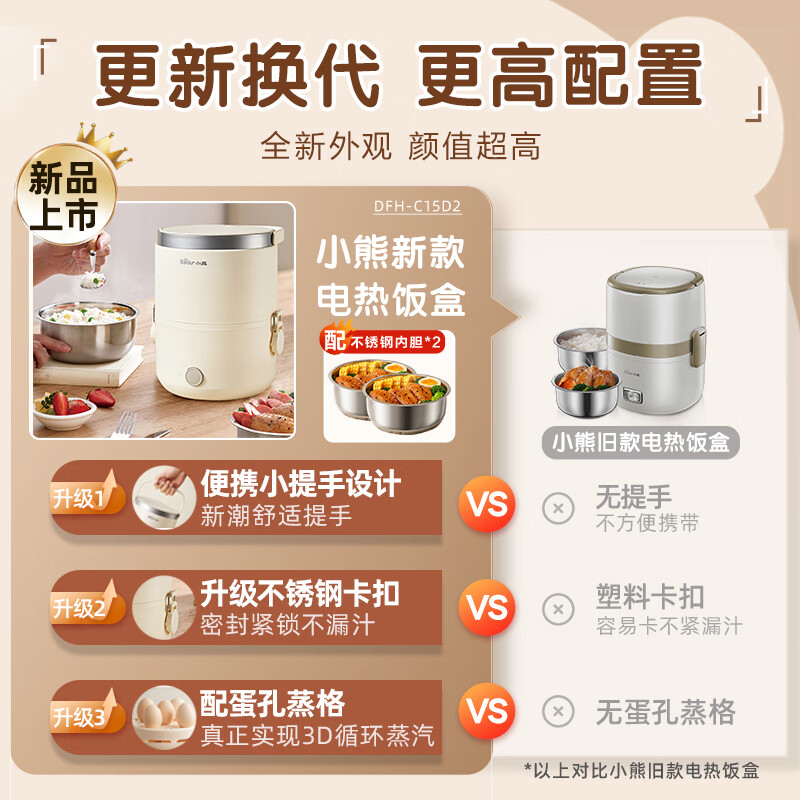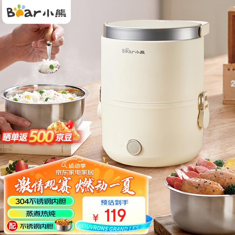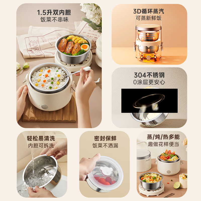 小熊(Bear)电热饭盒 加热饭盒 保温饭盒 可插电便携式蒸煮上班族1.5L双层不锈钢内胆密封保鲜多功能DFH-C15D2价格:119.00元!
