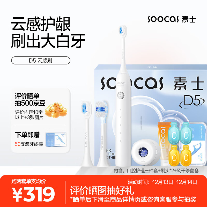 素士SOOCAS 声波震动电动牙刷成人 软毛护龈美白亮白风干杀菌电动牙刷礼盒 免打孔挂墙式 D5云感刷价格:389.00元!
