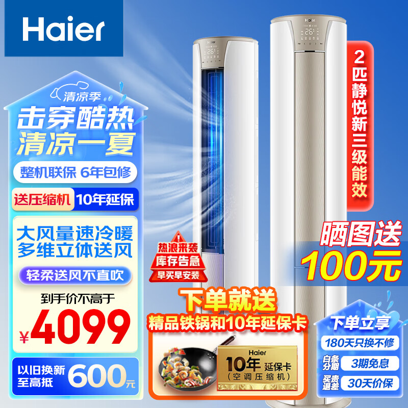 海尔(Haier)空调柜机2匹静悦变频新能效客厅圆柱空调立式柜机自清洁立式空调家用办公大风量价格:4099.00元!