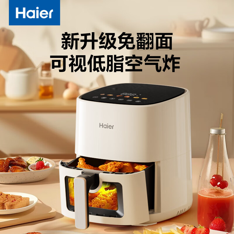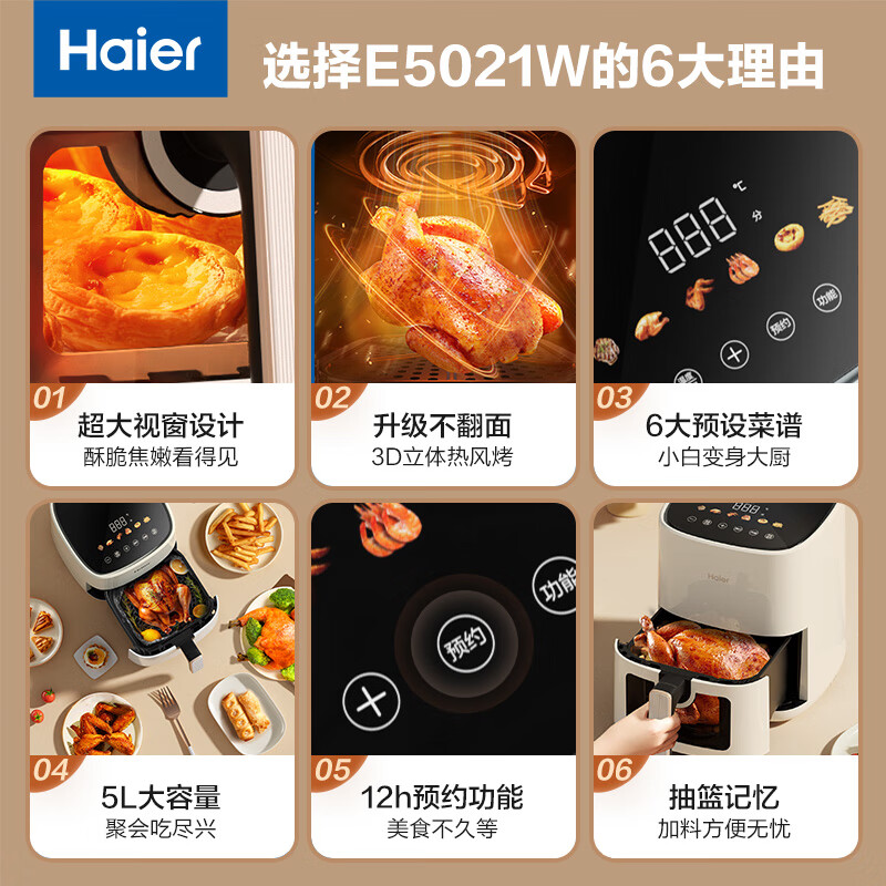 海尔空气炸锅5L家用可视大容量触控 不用翻面预约 不粘易清洁 低脂电炸锅炸烤箱一体机薯条机HA-E5021W价格:239.00元!