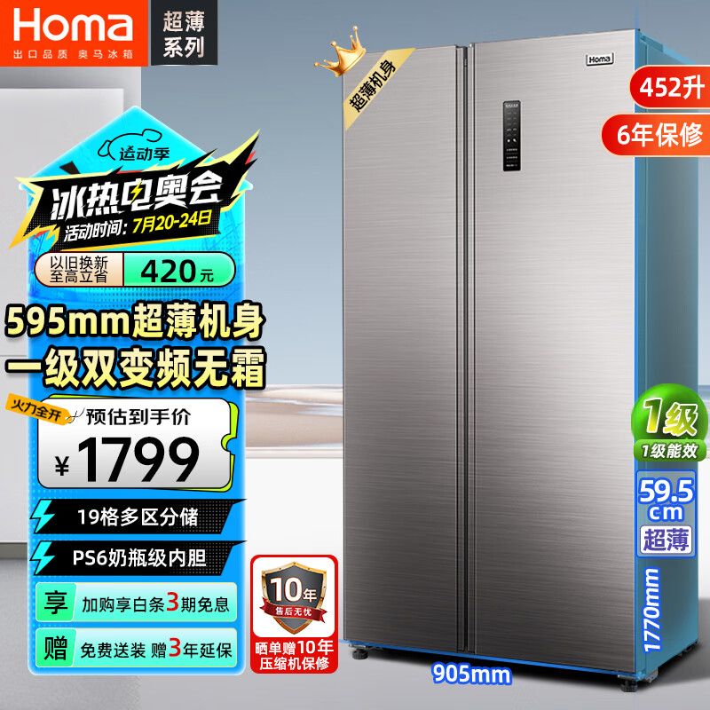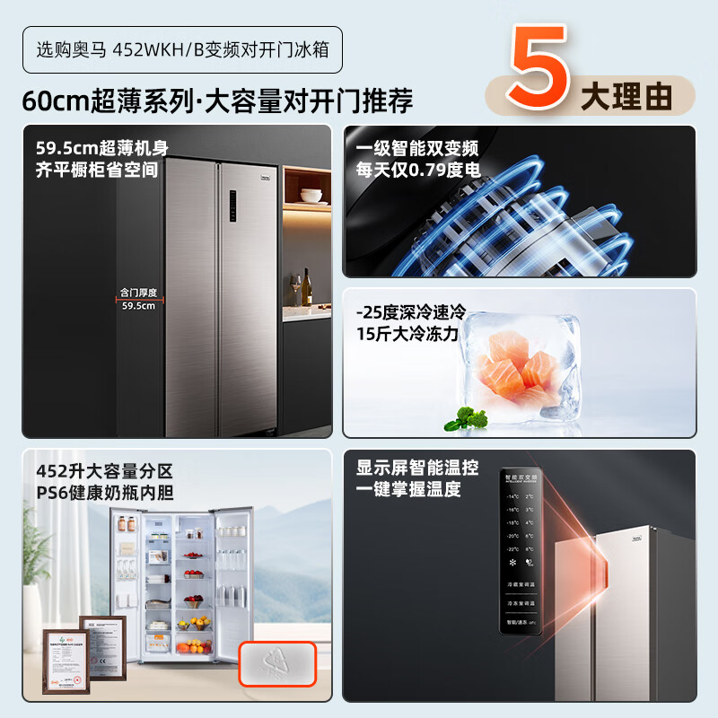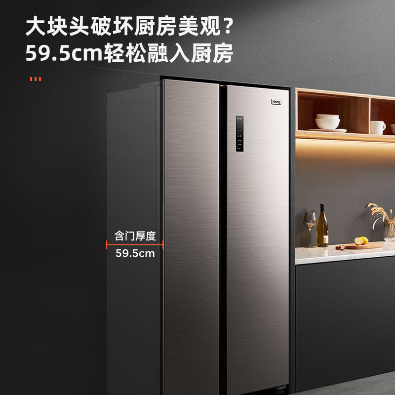 奥马(Homa)60cm以下超薄可嵌入452升薄款一级能效风冷无霜变频双开门对开门家用电冰箱 BCD-452WKH/B价格:1999.00元!
