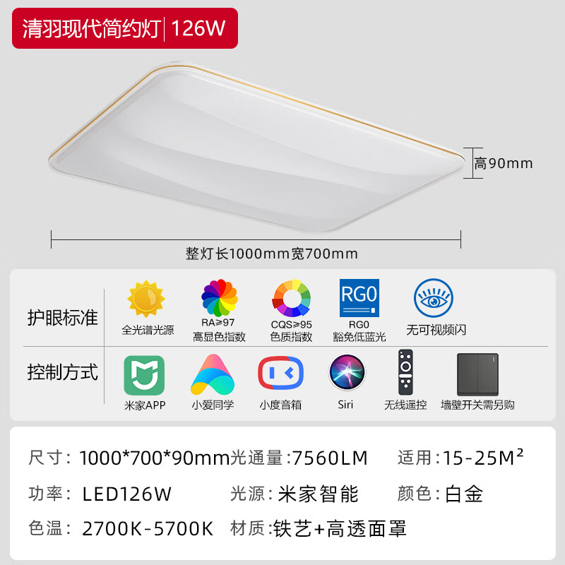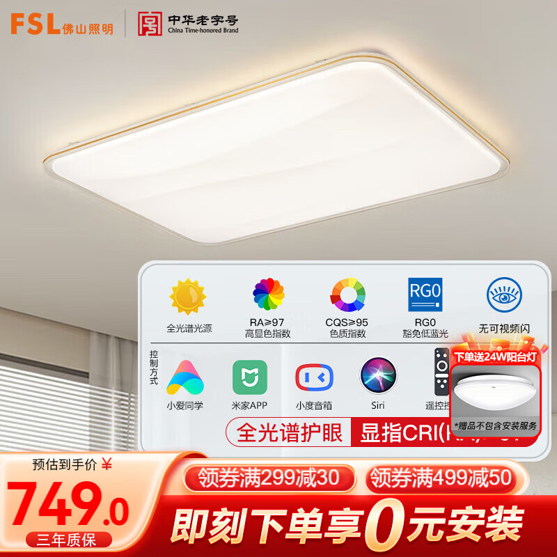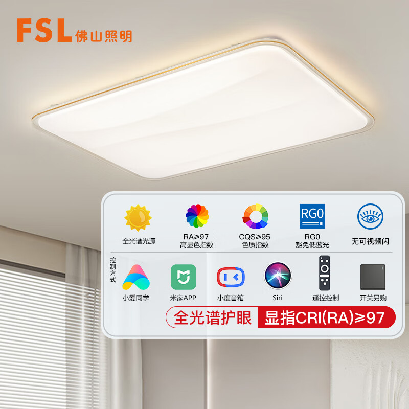 FSL佛山照明吸顶灯LED客厅灯低蓝光护眼高显97米家灯具灯饰清羽126W价格:799.00元!