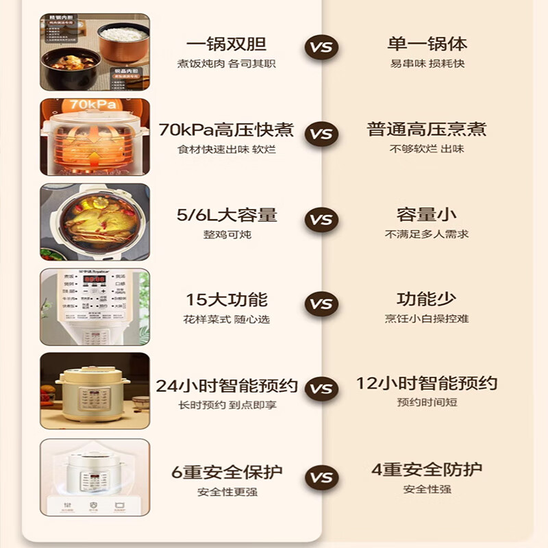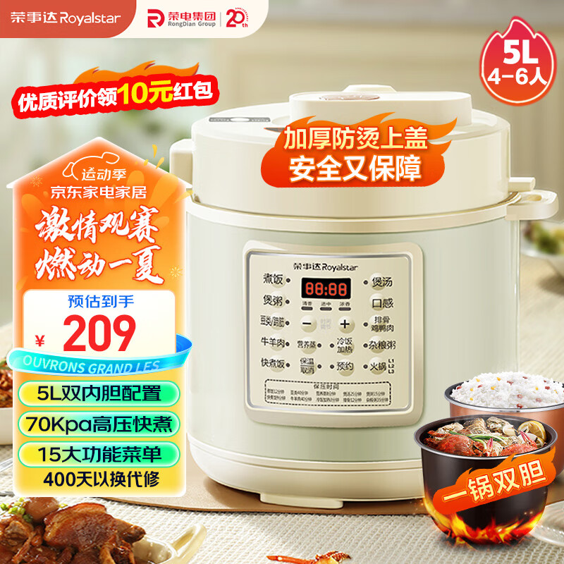 荣事达(Royalstar)电锅5L大容量全自动智能预约家用保温煲汤煮粥 面板易清洁双内胆YDG50-100A260高压锅4-6人价格:209.00元!