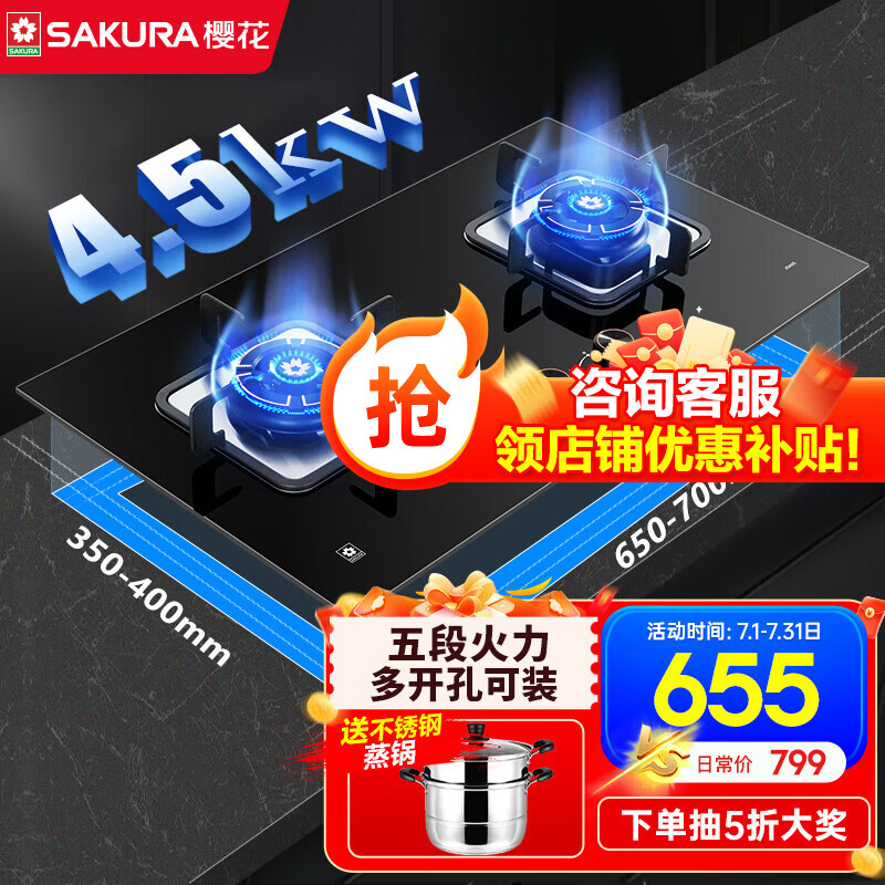 樱花(SAKURA)燃气灶天然气4.5KW大火力煤气灶双灶液化气灶台嵌入式台式两用家用炉灶具全铜火盖宽边底盘 JGA05【天然气4.5KW高效直火防爆】价格:645.00元!