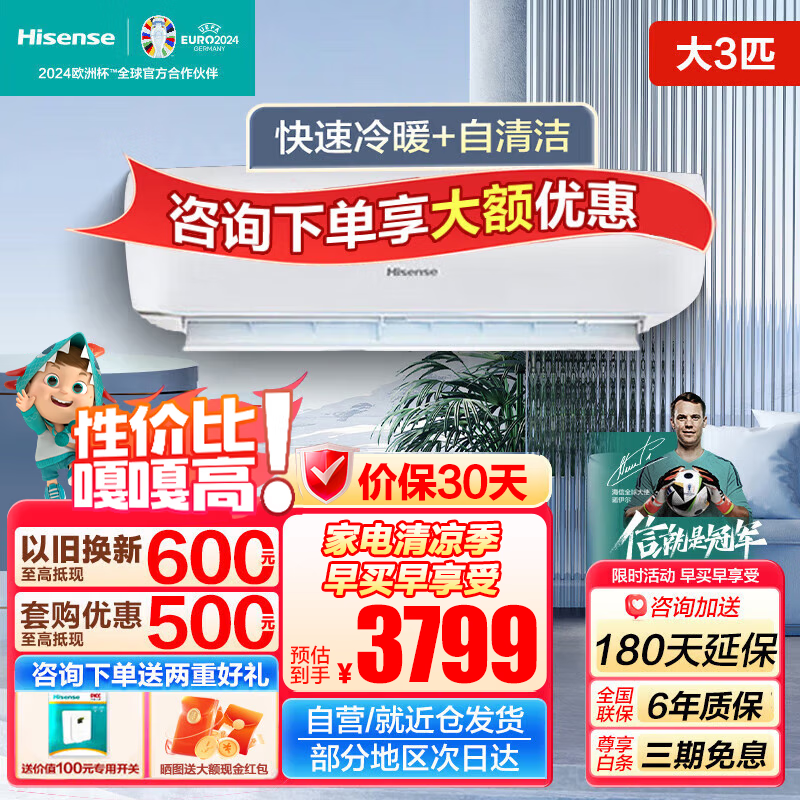海信(Hisense)大3匹 家用自清洁冷暖客厅空调挂机 舒适风 智控 壁挂式空调 二级能效 智控 72890-A2价格:3799.00元!