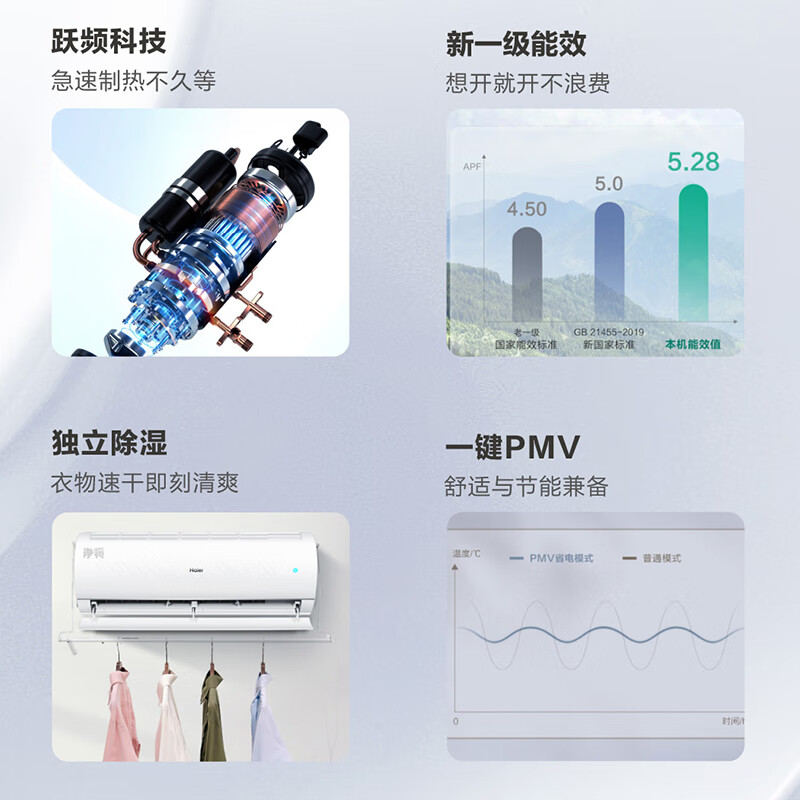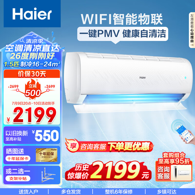 海尔(Haier)净畅 空调挂机 大1.5匹 新一级能效 变频冷暖空调 家用卧室壁挂式空调 独立除湿价格:2199.00元!