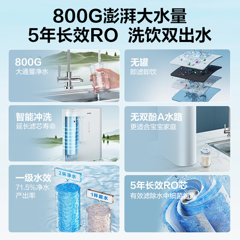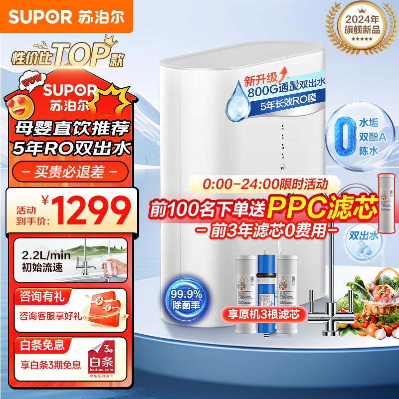 苏泊尔(SUPOR)净水器家用直饮机净水机RO反渗透纯水机800G大通量过滤器DR80滤水器台下软水机厨下厨房价格:1299.00元!