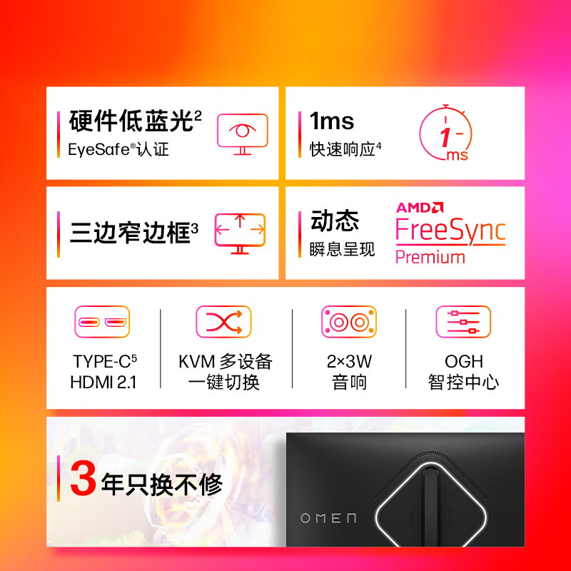 惠普(HP)暗影精灵电竞显示器 27英寸4K UHD 144Hz高刷 FreeSync TUV认证旋转升降电脑显示屏 27k价格:3999.00元!