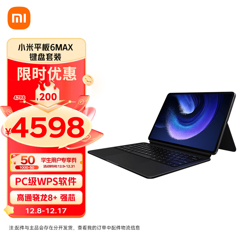 小米平板6 MAX 14英寸 高通骁龙8+ PC级WPS 2.8K 120Hz 12+256GB大屏办公平板笔记本电脑 黑色【键盘套装】价格:4598.00元!