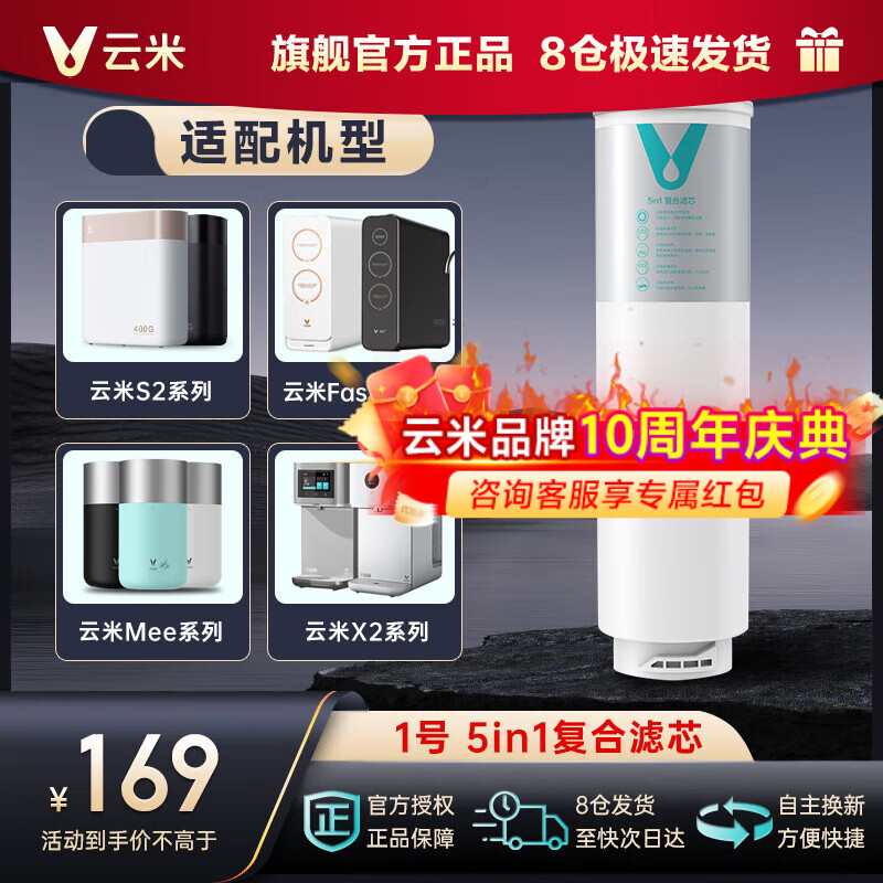 云米(VIOMI) 升级款云米净水器滤芯适配机型S2、Fast3、X2、Quick5、MeePlus、澎湃/Fast 1000G 1号5in1滤芯(不支持小蓝调/小白龙/小海豚)价格:169.00元!
