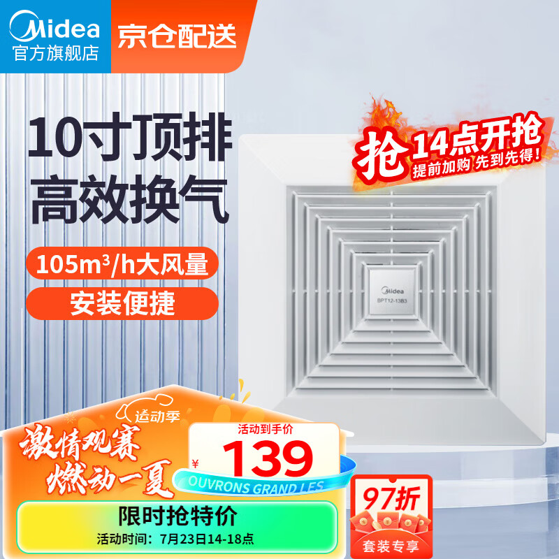 美的(Midea)【顶排】 排气扇卫生间浴室普通吊顶换气扇强厨房换气10寸排风扇价格:139.00元!
