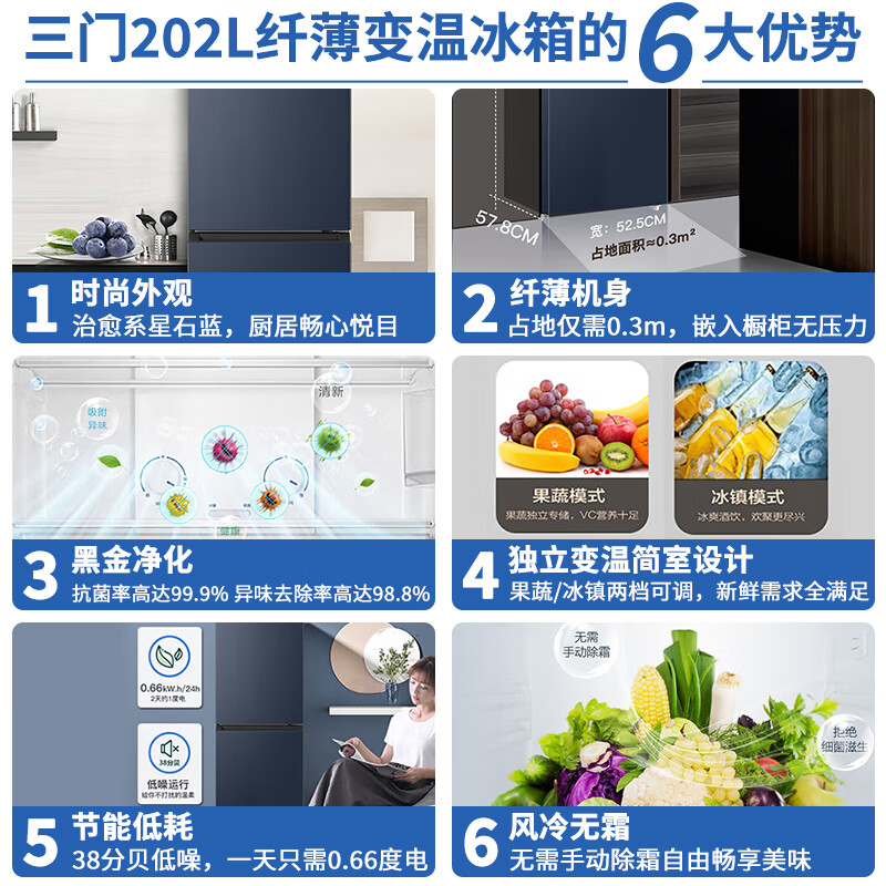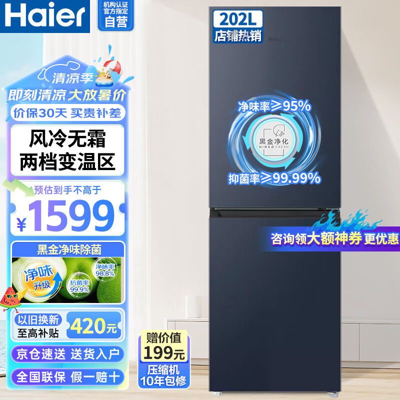 海尔(Haier)冰箱202升二门双门风冷无霜超薄小型电冰箱节能省电净味除菌两档变温家用租房宿舍公寓小冰箱价格:1599.00元!