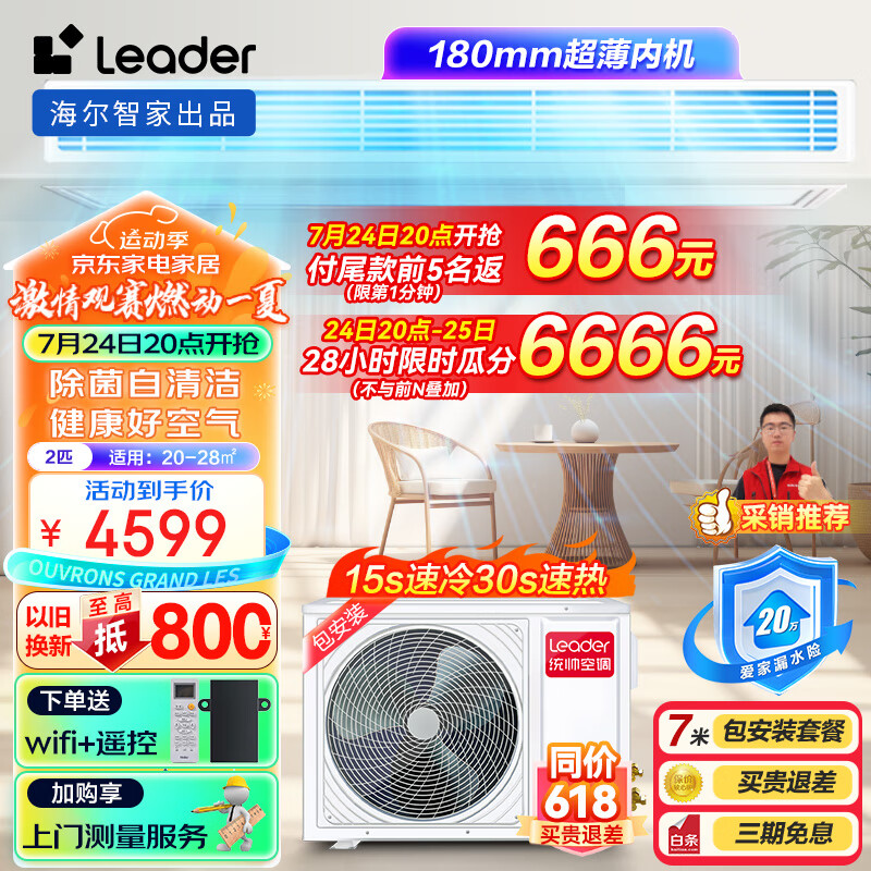 Leader海尔智家出品2匹风管机一拖一中央空调2p嵌入式客厅空调直流变频健康自清洁KFRd-50NW/71DCB82ST价格:4599.00元!