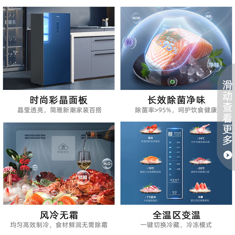 3、冰柜很好,符合预期。取物比起上开门的传统冰柜方便很多,也更容易分类存放。宽度仅52,夹缝就能存放。颜值也高。满意。