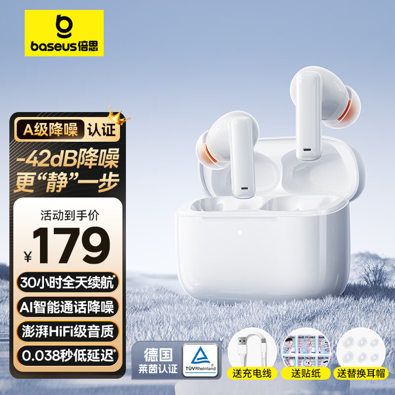 倍思M2 蓝牙耳机真无线 降噪耳机入耳式 42dB主动降噪音乐运动通话长续航通用苹果华为oppo小米手机 白价格:179.00元!