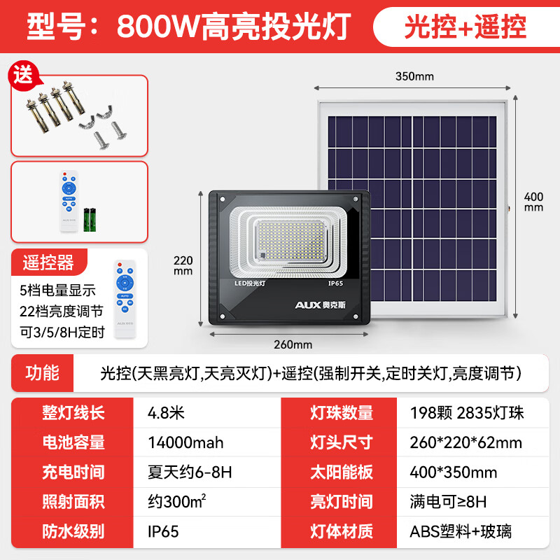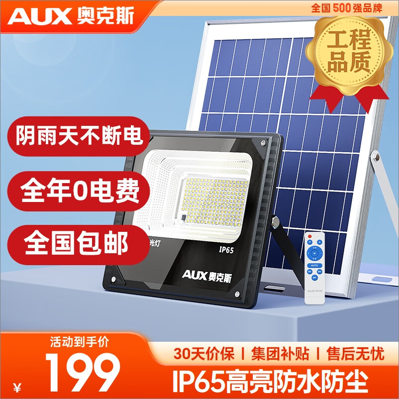 奥克斯(AUX)太阳能照明灯户外庭院灯路灯LED投光灯射灯柱头灯草坪灯遥控15000价格:199.00元!