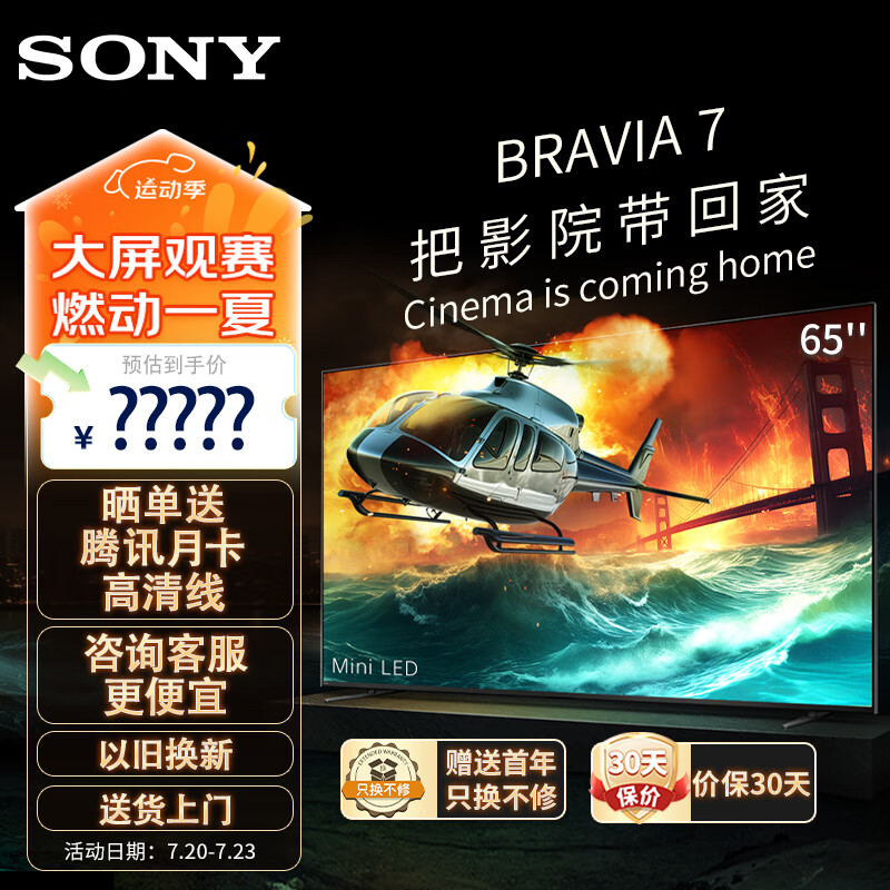索尼(SONY)K-65XR70 65英寸 索尼电视7系 MiniLED电视 AI画质音质优化 XR认知芯片 旗舰液晶游戏电视机价格:12979.00元!