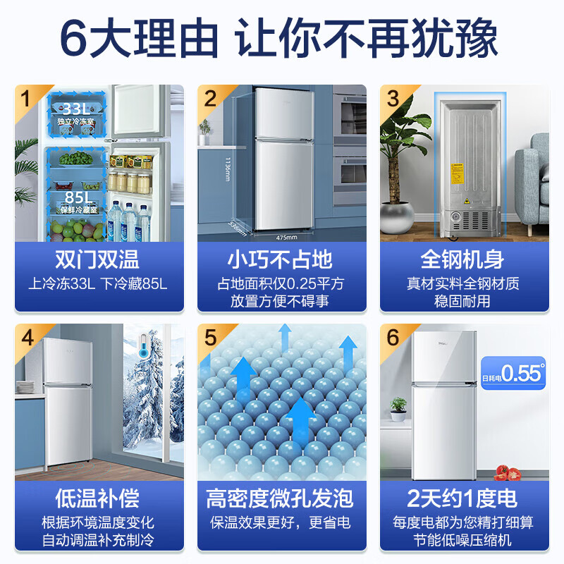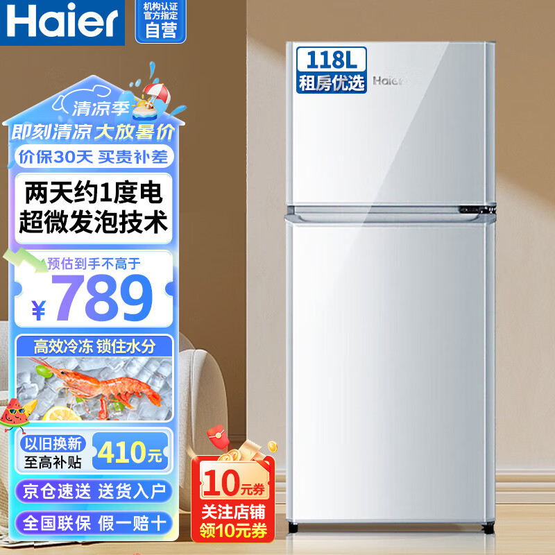 海尔(Haier)冰箱118升二门双开门迷你小冰箱节能省电家用超薄租房宿舍冷藏冷冻家电小型直冷电冰箱BCD-118TMPA价格:789.00元!