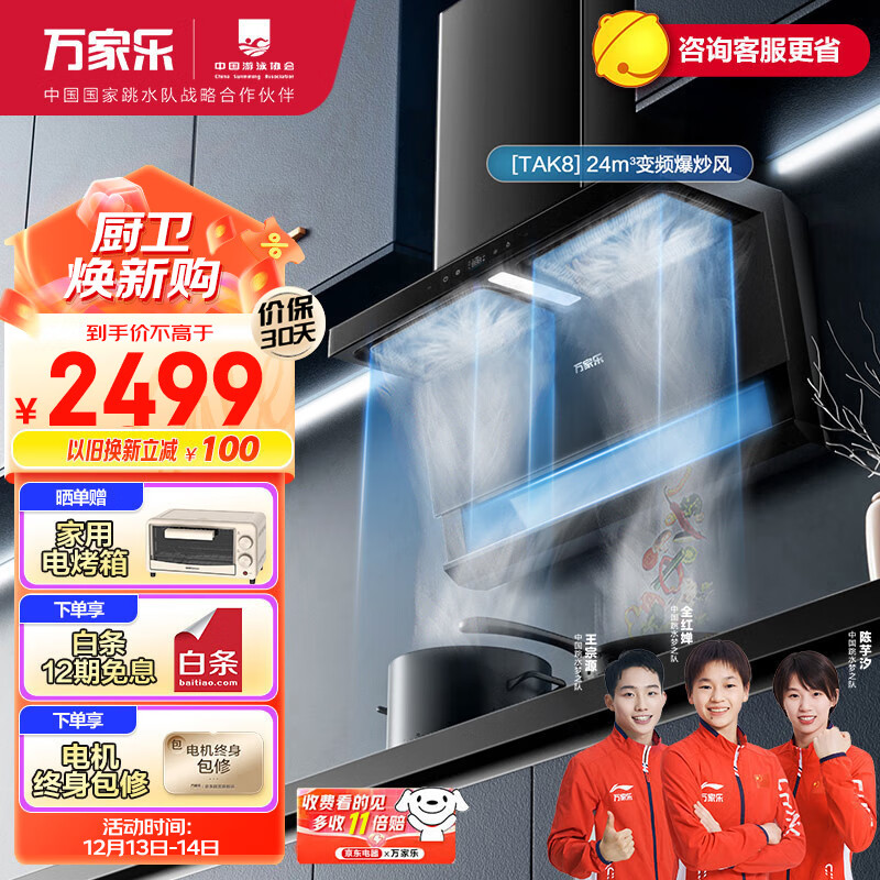 万家乐顶侧双吸油烟机 三腔变频静音油烟机 24m3/min大风量挥手自清洗 1050Pa抽油烟机CXW-320-TAK8价格:2599.00元!