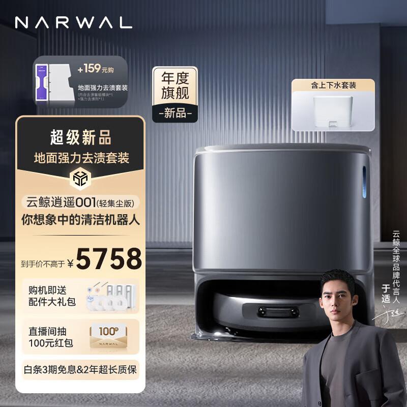 云鲸扫地机器人逍遥001(轻集尘款)上下水版+地面去渍套装价格:5758.00元!