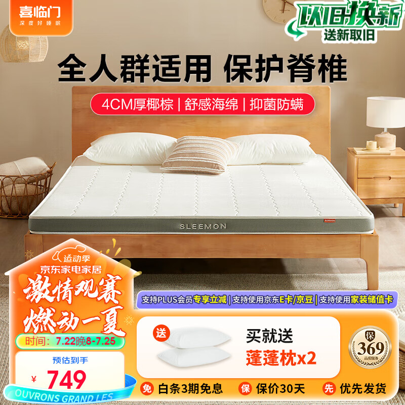 喜临门椰棕薄垫子 4CM舒脊椰棕偏硬席梦思儿童老人床垫 伊菲H6 1.0x2米价格:749.00元!