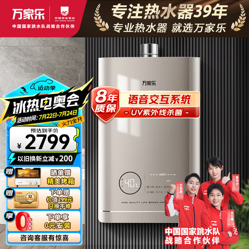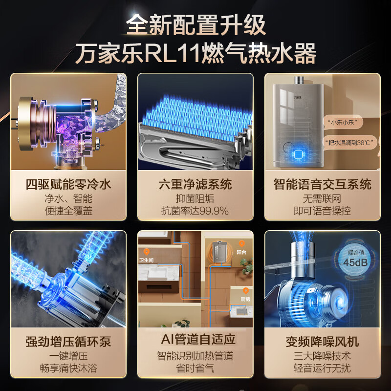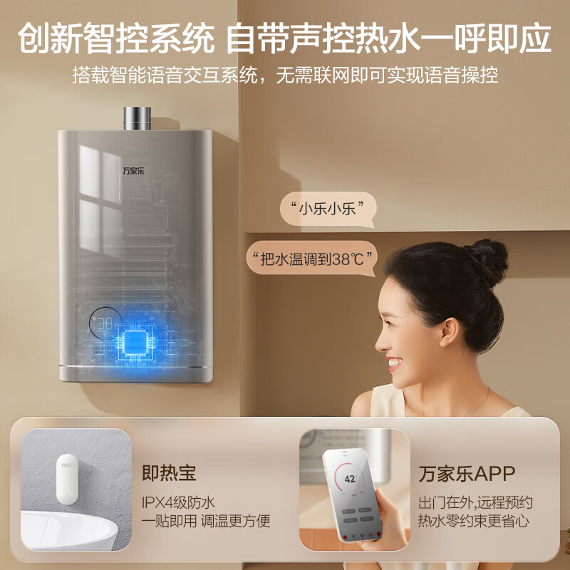 万家乐16升 燃气热水器四驱增压零冷水天然气语音无线分控AI智能节能紫外线杀菌阻垢净滤芯JSQ30-16RL11价格:2799.00元!