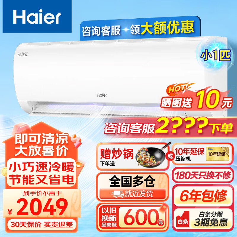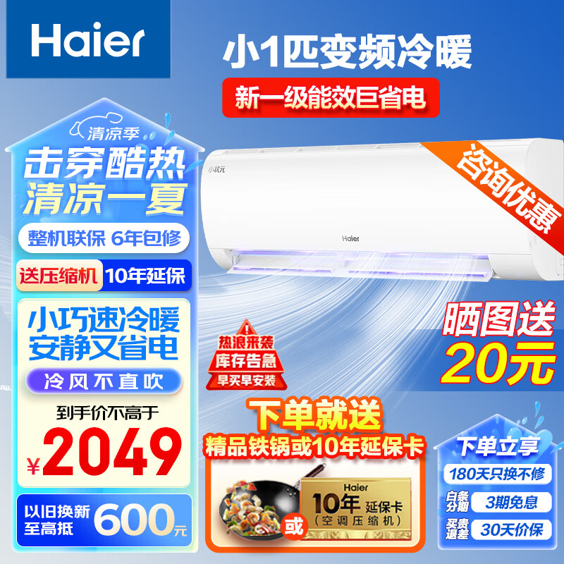 海尔(Haier)空调挂机小1匹新一级能效变频节能冷暖壁挂式小户型家用卧式自清洁空调省电价格:2049.00元!