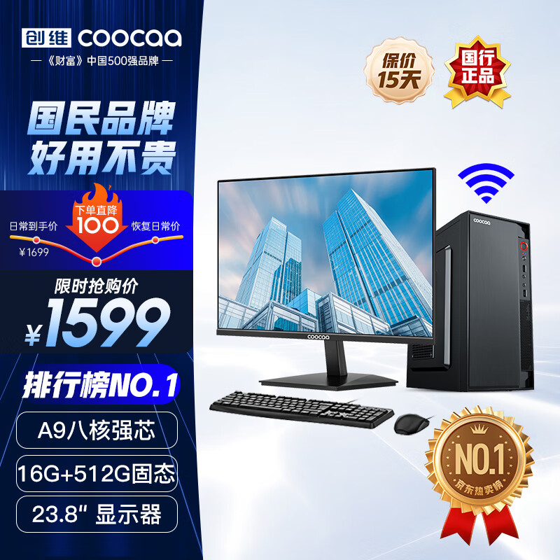 酷开 创维电脑 八核主机办公商用台式机电脑整机(AMD八核A9 16G 512G M.2 WiFi 联保)23.8英寸价格:1599.00元!