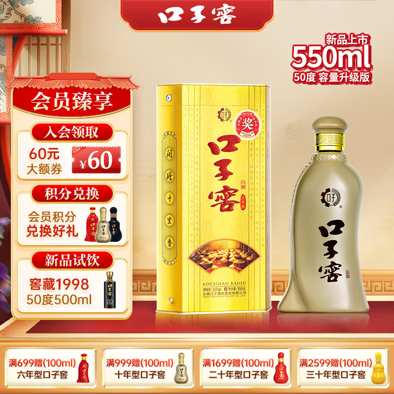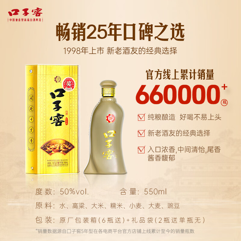 口子窖 五年型 兼香型白酒 50度 550ml 【容量升级】纯粮酿造价格:148.00元!