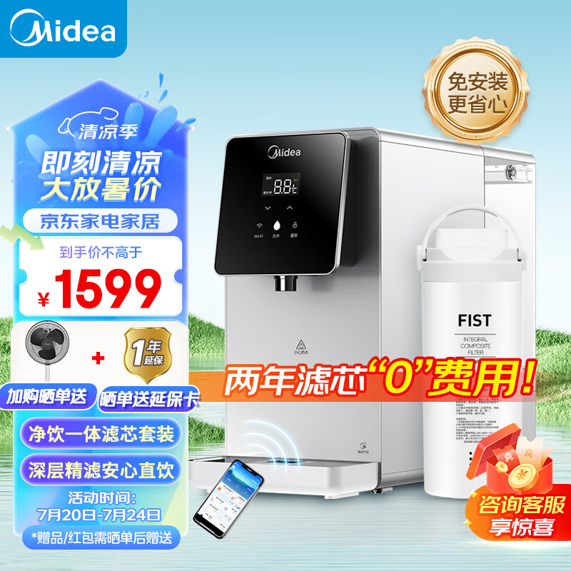 美的(Midea) 白泽台式加热净水器 饮水机家用 即热式直饮机净饮一体机 WIFI智控免安装 JR2182T-RO滤芯套装价格:1599.00元!
