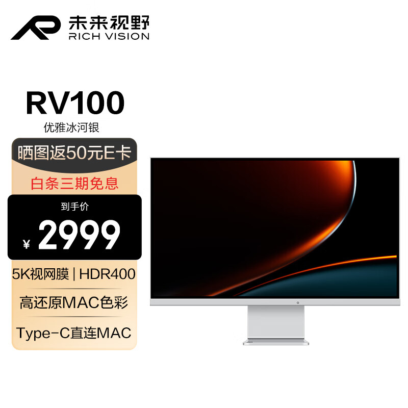 未来视野 27英寸5K视网膜显示器 果粉屏 设计剪辑专业校色电脑屏幕 Type-C 65W投屏充电 HDR400 RV100 冰河银价格:2999.00元!