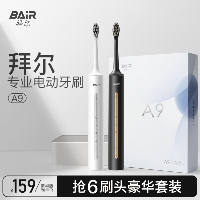 拜尔A9 电动牙刷成人声波充电式震动软毛情侣款学生党智能自动牙刷男女士 送女朋友 曜黑(豪华版6刷头)价格:169.00元!