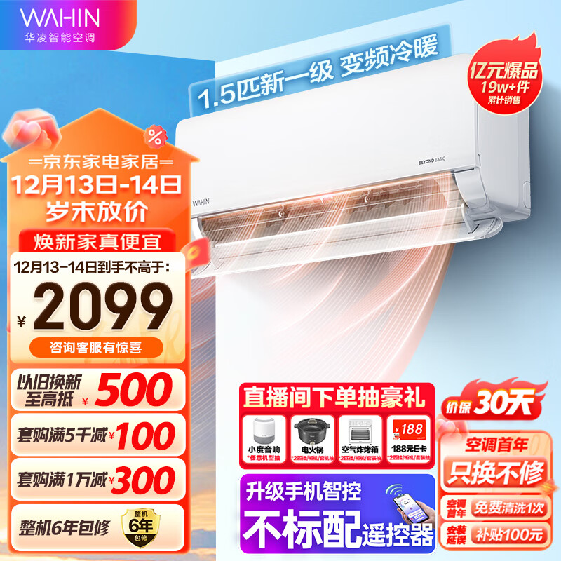 华凌空调新一级能效变频冷暖大风口1.5匹客厅卧室挂式空调挂机智能京东小家KFR-35GW/N8HL1以旧换新价格:2099.00元!