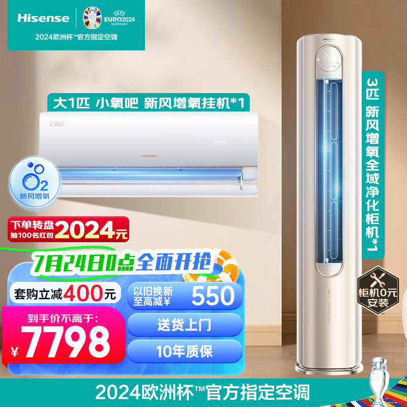 海信(Hisense)新风增氧空调套装 一室一厅 新一级能效全域净化客厅柜机卧室家用挂机(大1匹+3匹)价格:7798.00元!