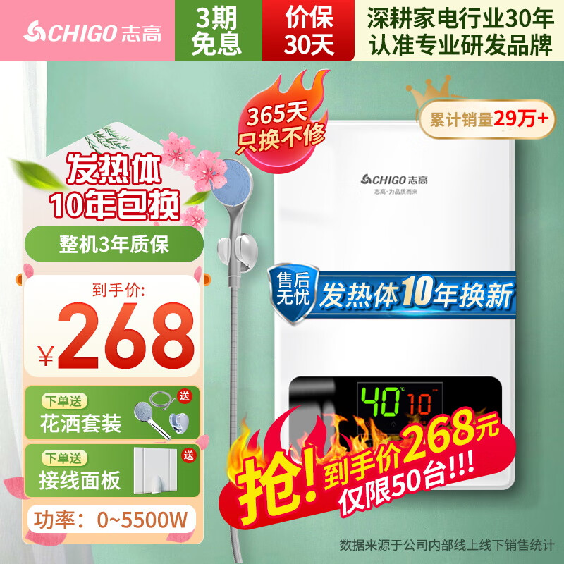 志高(CHIGO)即热式电热水器超薄小厨宝5500W变频恒温智能省电出租房家用洗澡免储水水龙头防漏电KBR-Y6S价格:268.00元!