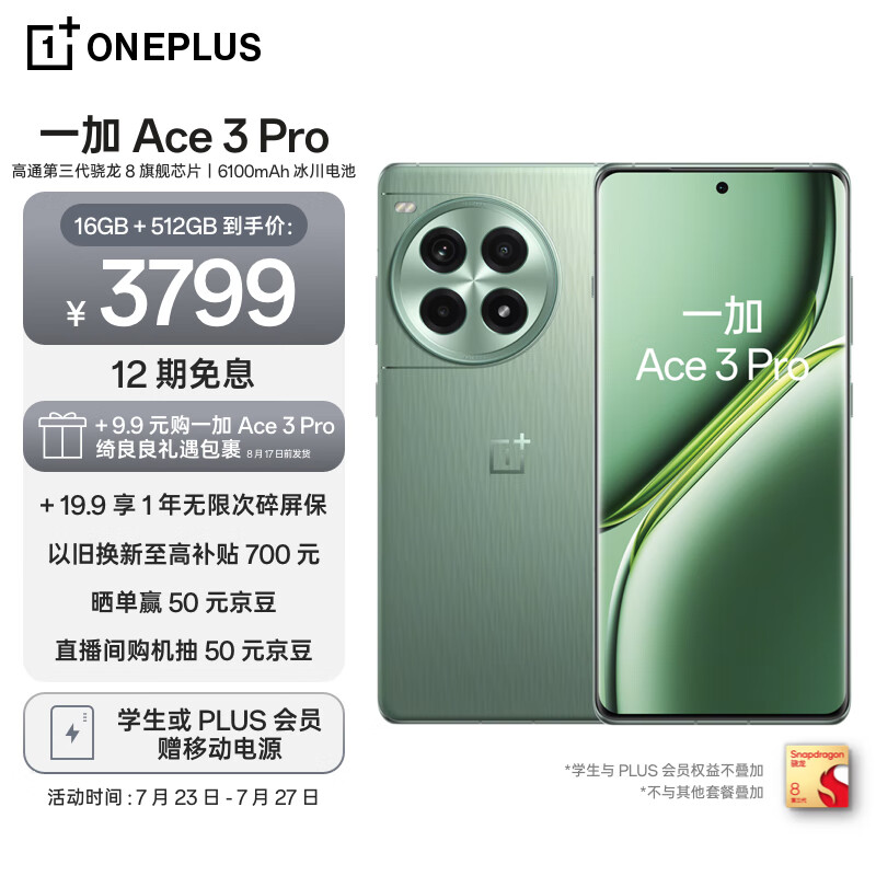一加 Ace 3 Pro 16GB+512GB 绿野素青 第三代骁龙 8 旗舰芯片 6100mAh 冰川电池 AI智能游戏手机价格:3799.00元!