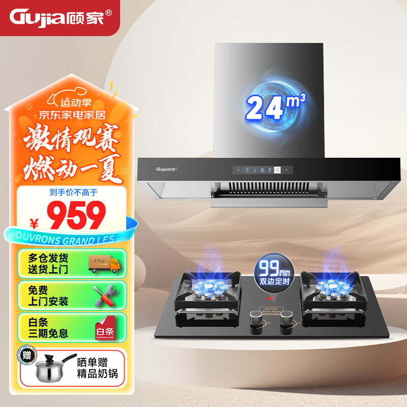 顾家(Gujia)抽油烟机灶具套装25爆炒大吸力家用欧式顶吸油烟机5.0KW燃气灶两件套(液化气)价格:1259.00元!
