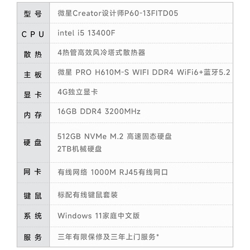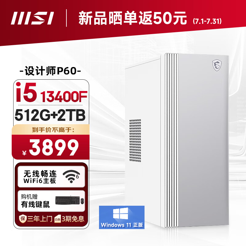 微星 设计师P60办公台式电脑(i5-13400F 16G 512G+2T 4G独显)商用全套diy组装整机迷你单主机价格:4099.00元!